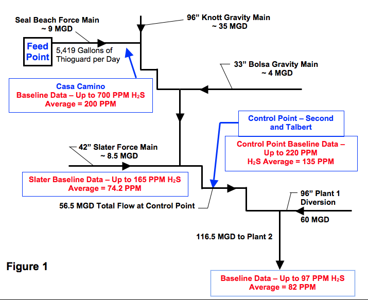The primary objective of the test was to reduce H2S gas at the control point located at Second and Talbert, 10.2 miles from the feed site. In addition, this configuration was chosen by OCSD to examine concerns regarding potential H2S gas flare-off, as pH decreases with dilution from the Plant 1 diversion line. Flow of 56.6 mgd from the Knott is combined with 60 mgd from the Plant 1 diversion. The combined flow then travels approximately 5 miles (one hour) to treatment plant No. 2 located in Huntington Beach. If dilution caused flare-off, it would result in a substantial increase in H2S gas at Plant 2.