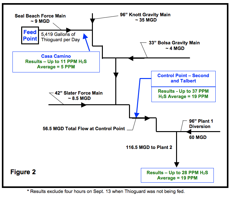From Sept. 6 to Sept.18, 2000, the Knott gravity main flowed an average of 56.6 mgd. This flow was treated using a daily average of 5,419 gallons of Thioguard (95.73 gallons per mgd). Thioguard was fed at the Seal Beach pump station located on the southwest corner of Westminster and Seal Beach Boulevards. The Seal Beach pump station consists of two force mains (east and west) discharging 2.6 miles downstream. The west force main is 42 inches in diameter with a VFD pump, while the east force main is 30 inches in diameter with a duplex pump for peak periods.