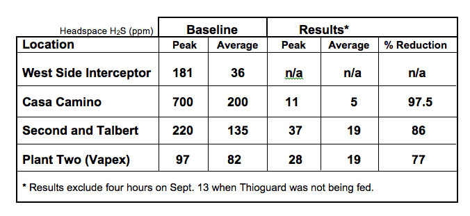 Summary results presented here include peak and average headspace H2S gas for the pretreated conditions (baseline) and the treated conditions (results). Industrial Scientific STX-70 recorders sampled continuously reporting five-minute averages. The STX-70s were calibrated with 25 ppm H2S span gas and field readings were cross-verified with Sensidyne samples taken at the monitoring points to insure instrument accuracy.